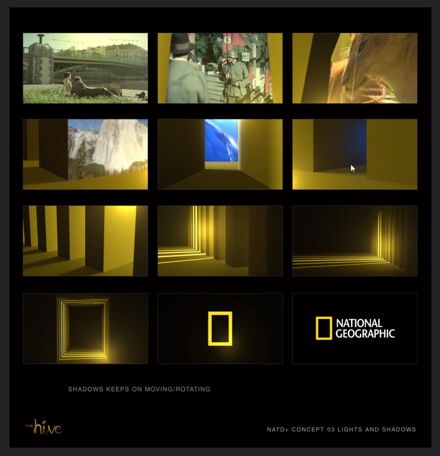 The initial pitch was to create short 15 - 30 national geographic TV slots that showcase upcoming new shows on the platform. Our team creative collaboration was to emulate retro 1980 national geographic commercial focusing on the traditional nat geo logo.
